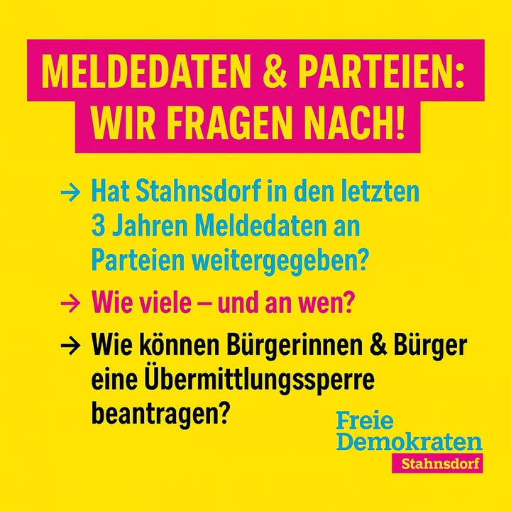 Auf Anregung der FDP hat die CDU/FDP-Fraktion in der Gemeindevertretung Stahnsdorf eine offizielle Anfrage an den Bürgermeister gestellt. Hintergrund ist die aktuelle Diskussion über die Weitergabe von Meldedaten durch Kommunen an Parteien für Wahlwerbung. Wir wollen Klarheit: 1️⃣ Hat Stahnsdorf in den letzten drei Jahren Meldedaten an Parteien übermittelt? Wenn ja: wie viele – und an wen? 2️⃣ Welche Einnahmen sind dabei durch Gebühren entstanden? 3️⃣ Wie können Bürgerinnen und Bürger eine Übermittlungssperre beantragen – persönlich, schriftlich oder online? 4️⃣ Wo und wie informiert die Gemeinde regelmäßig über dieses Recht (z. B. Amtsblatt, Internetseite, Aushang)? ℹ️ Unser Ziel: Mehr Transparenz und eine aktive Information der Bürgerinnen und Bürger über ihre Rechte. 👉 Wir werden die Antworten in der nächsten Sitzung der Gemeindevertretung erhalten und anschließend öffentlich berichten. #Stahnsdorf #FDP #Transparenz #Datenschutz